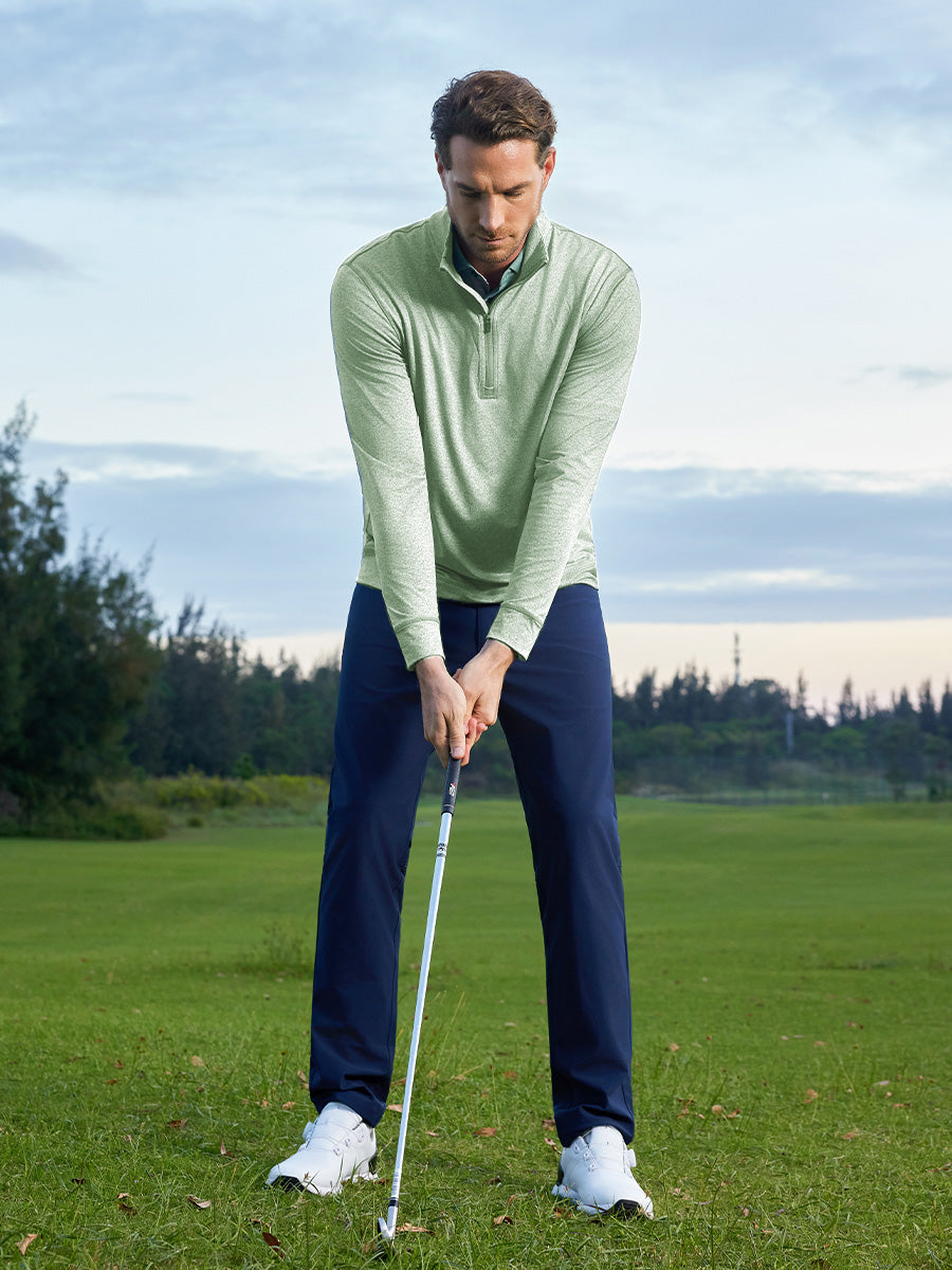 Meet our Quarter Zip Melange Pullover, the ultimate choice for golf aficionados. This men's sweatshirt is all about style and performance, featuring a sleek quarter zip placket with a windproof flap for that modern touch and easy temperature control. Crafted from a high-performance 4-way stretch brushed knit of polyester and spandex, it offers moisture-wicking, lightweight, and breathable comfort, ensuring you move with ease and style on the golf course. Elevate your game with comfort and sophistication!