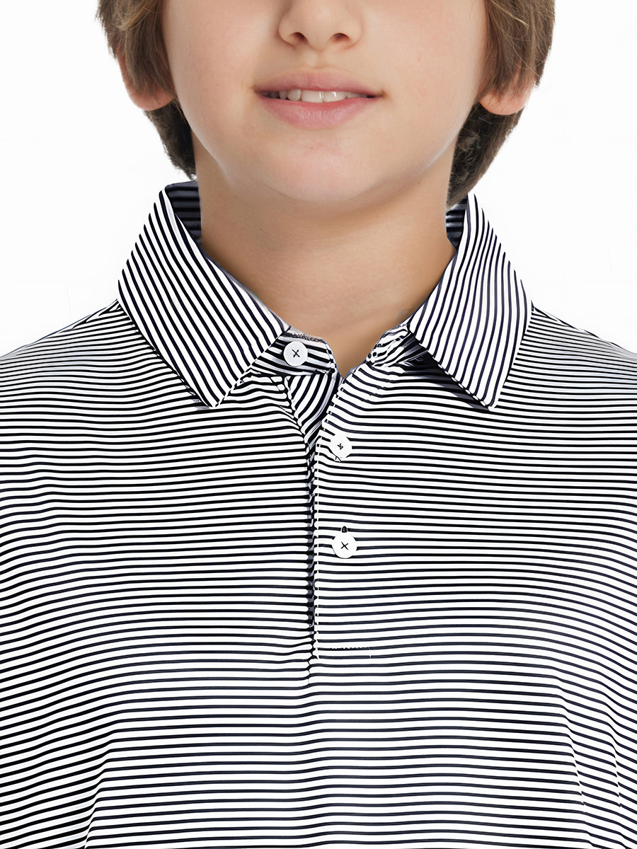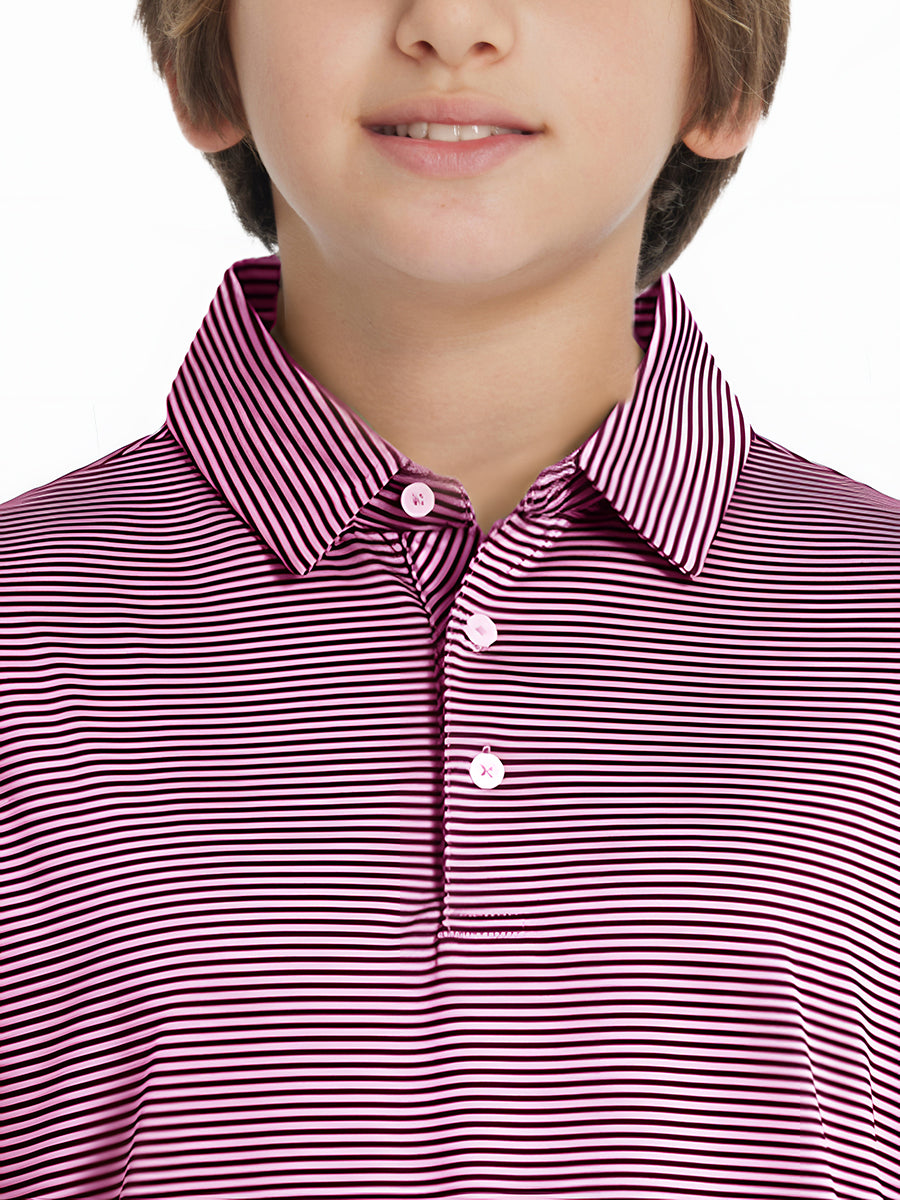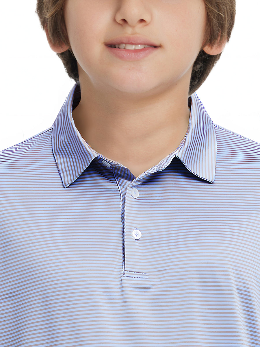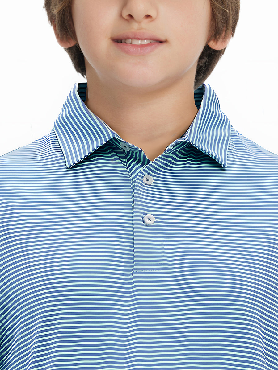 Performance Cooling Polo - Youth crafted from polyester spandex striped jersey. Lightweight, moisture-wicking, quick-drying, UPF 50+, soft hand-feel, 4-way stretch for comfort and breathability. Special construction ensures a no-curl collar and maintains shape.